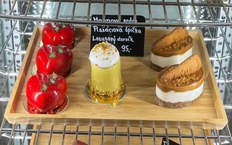 Likérová špička, Pekanový dortík (bez lepku) a a kelímkové zákusky Míša, Panna Cota aTiramisu.